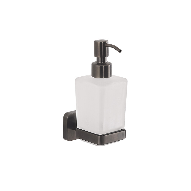 in acciaio inox e CROMALL con contenitore in vetro satinato ed erogatore in acciaio inox. Fissaggio a muro con viti. Fissaggio con biadesivo carico testato 4 kg. Dimensioni 6,3×11,7xh17,3 cm.