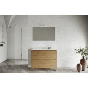 mobile bagno easy 2c sospeso 100 rovere naturale cm.101xh138x46 struttura e frontale in nobilitato cassetti con sponde in metallo e chiusura rallentat lavabo in ceramica bianco lucido specchio a filo con cornice dietro in plastica colore grigio, reversibile, fischer inclusi lampada led ip44